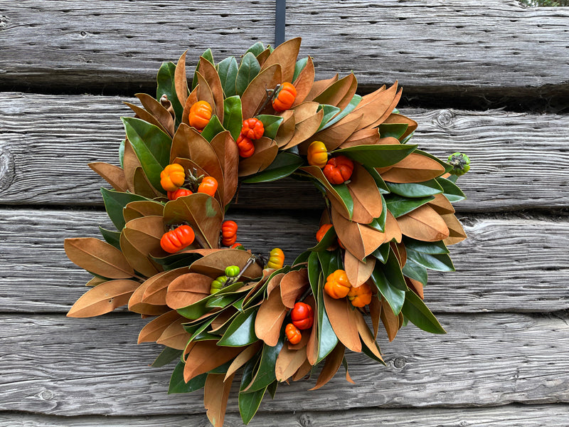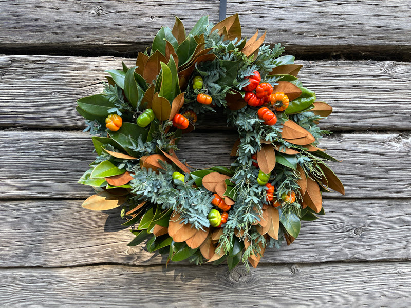 A classic Southern statement: magnolia’s deep green leaves with warm, golden-copper undersides, finished with understated pumpkin accents for a refined autumn palette. -