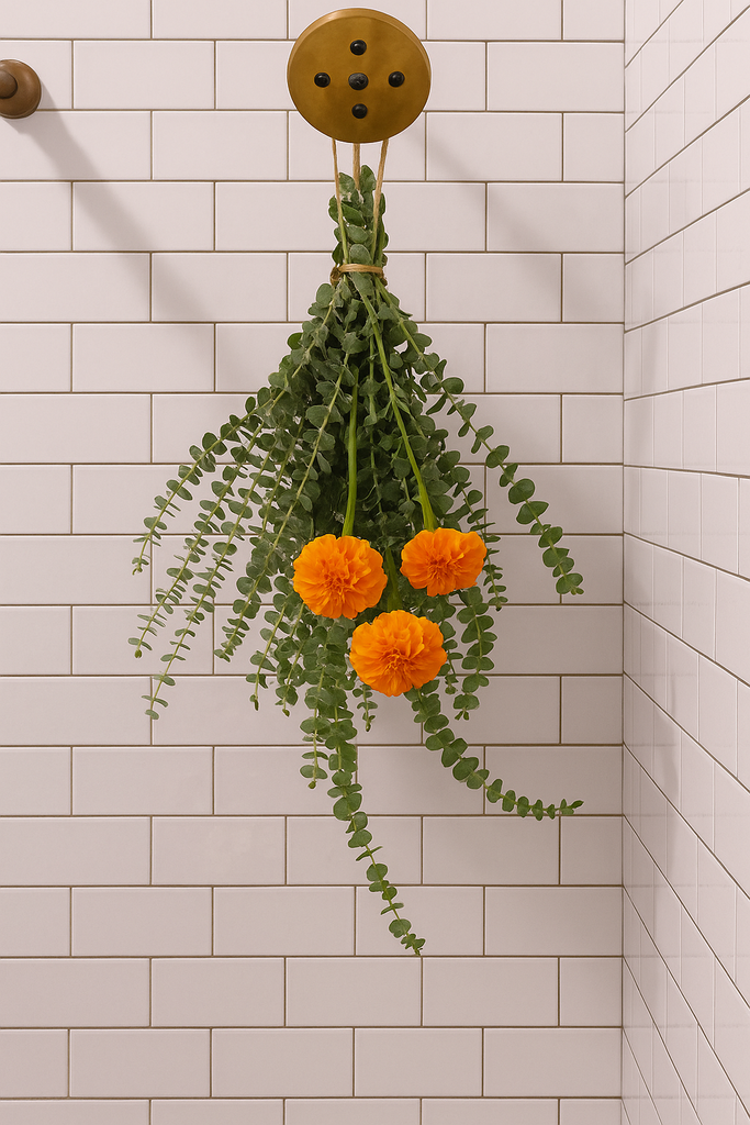 Trim the end of the protea steam and add to a vase with water for longevity, or bundle together with the eucalyptus. Banksia may go better in a vase instead of the shower due to its large flower size.