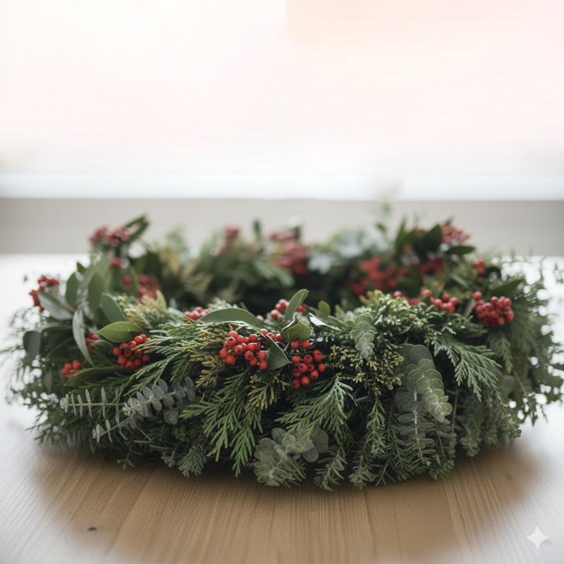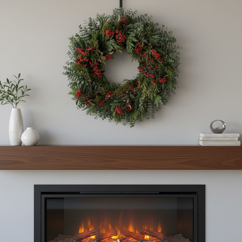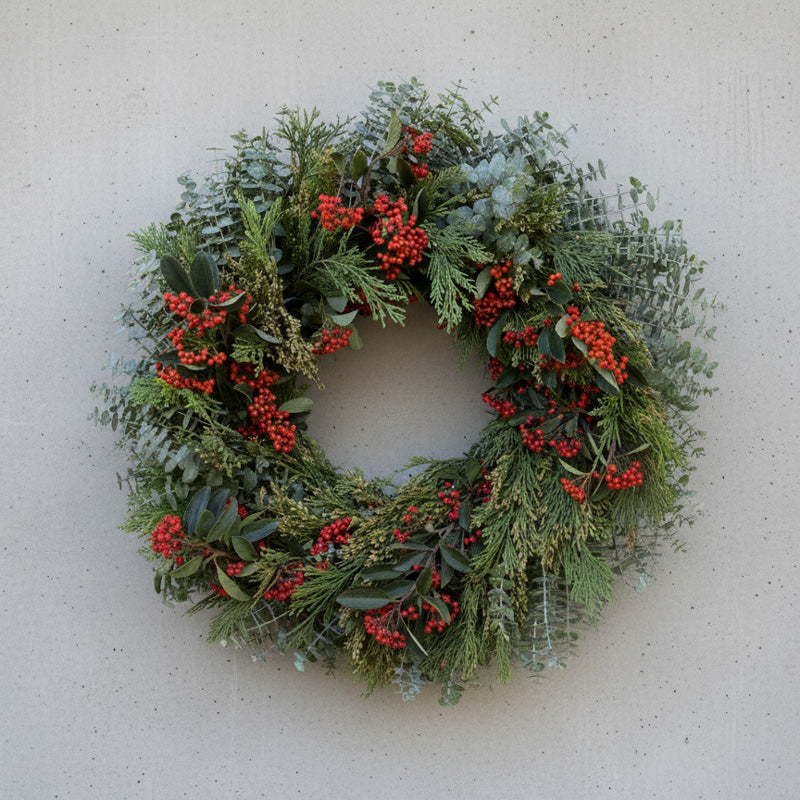 Hand-selected, hand-assembled, and crafted from freshly cut incense cedar, Baby Blue eucalyptus, and real cotoneaster berries.