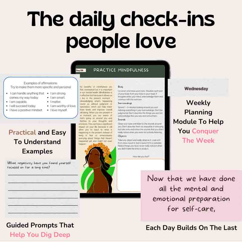 Take the 30 day self care journey with 45 pages of journal prompts, exercises, and readings to get your mind in the right place to improve your life.