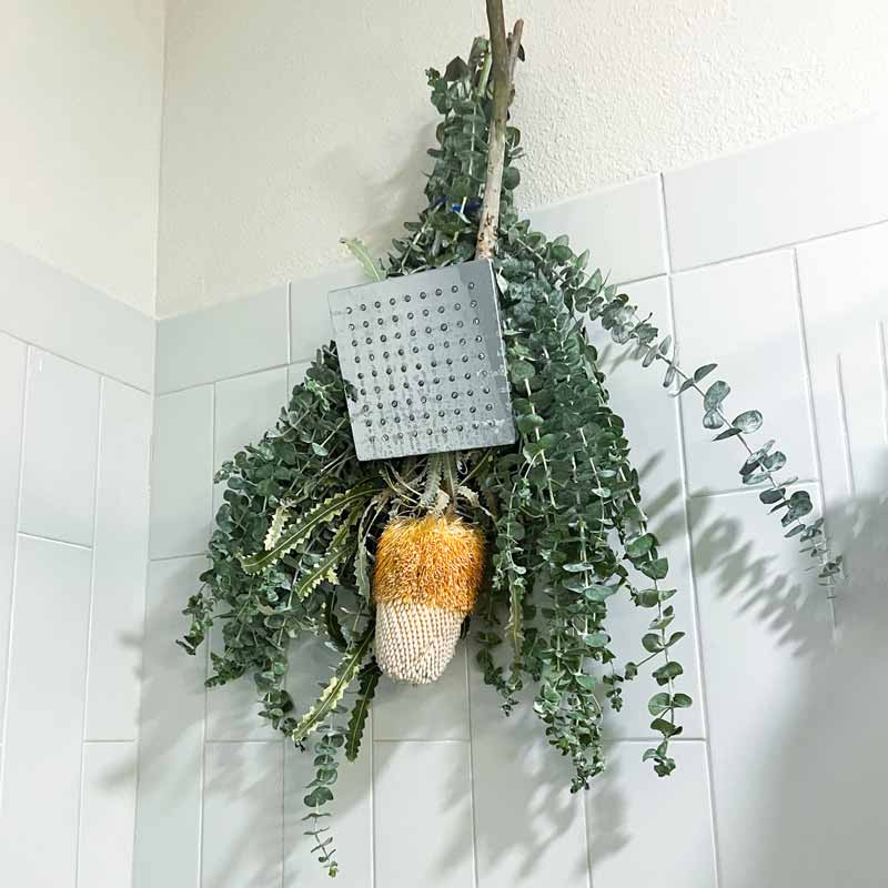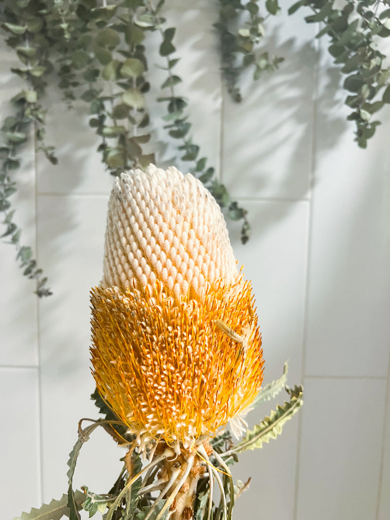 Trim the end of the protea steam and add to a vase with water for longevity, or bundle together with the eucalyptus. Banksia may go better in a vase instead of the shower due to its large flower size.