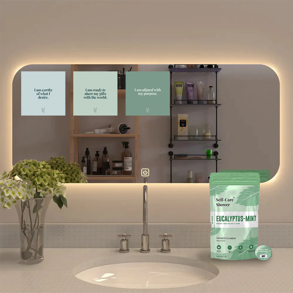 Instructions are included but here's how our ultimate shower experience would go. Turn on the warm water and take a deep breath. Step in the shower and place a fresh shower steamer on the shower floor. While the steamer is fizzing, choose your affirmation card to guide your shower, take another deep breath as you wet and place the card on the shower wall. By now you should be able to smell the soothing aroma from the shower steamer as well as the fresh eucalyptus. After a long, muscle relaxing shower, you step out, and smell the lavender and rosemary in a vase on the counter...