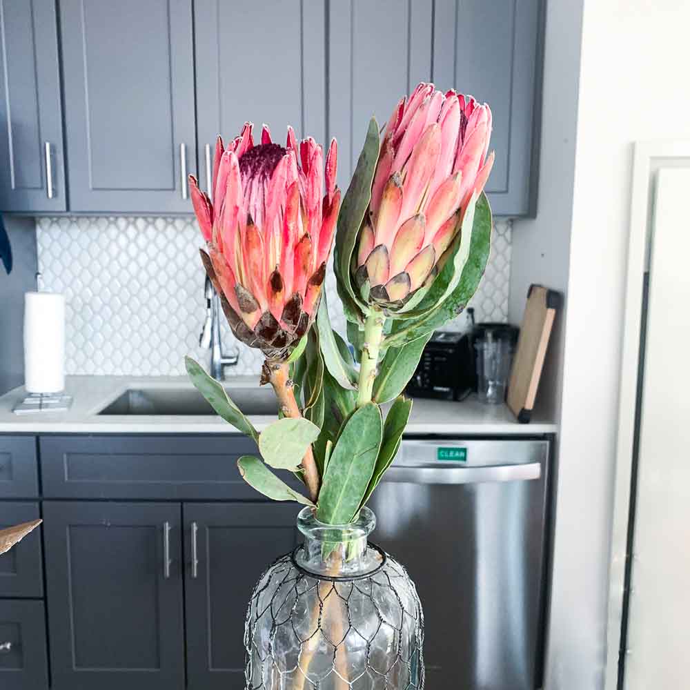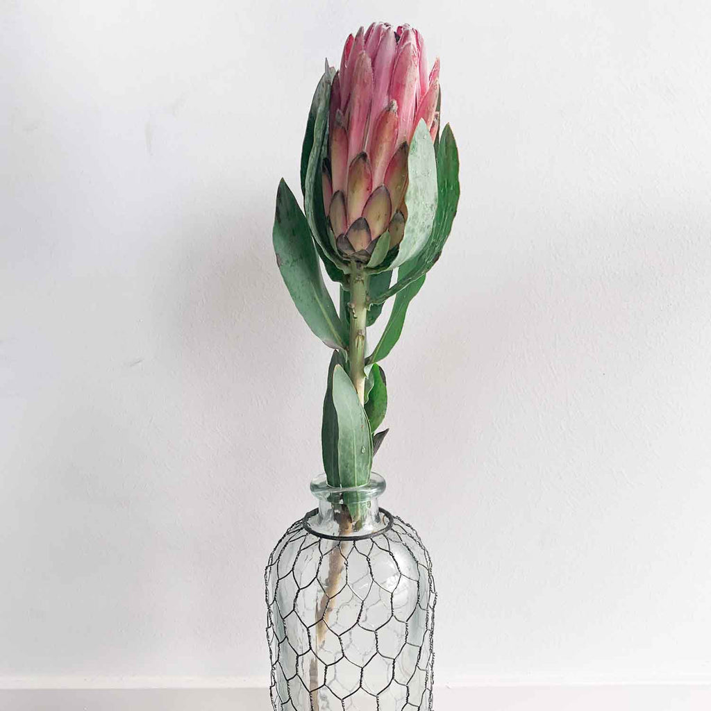 Trim the end of the protea steam and add to a vase with water for longevity, or bundle together with the eucalyptus.